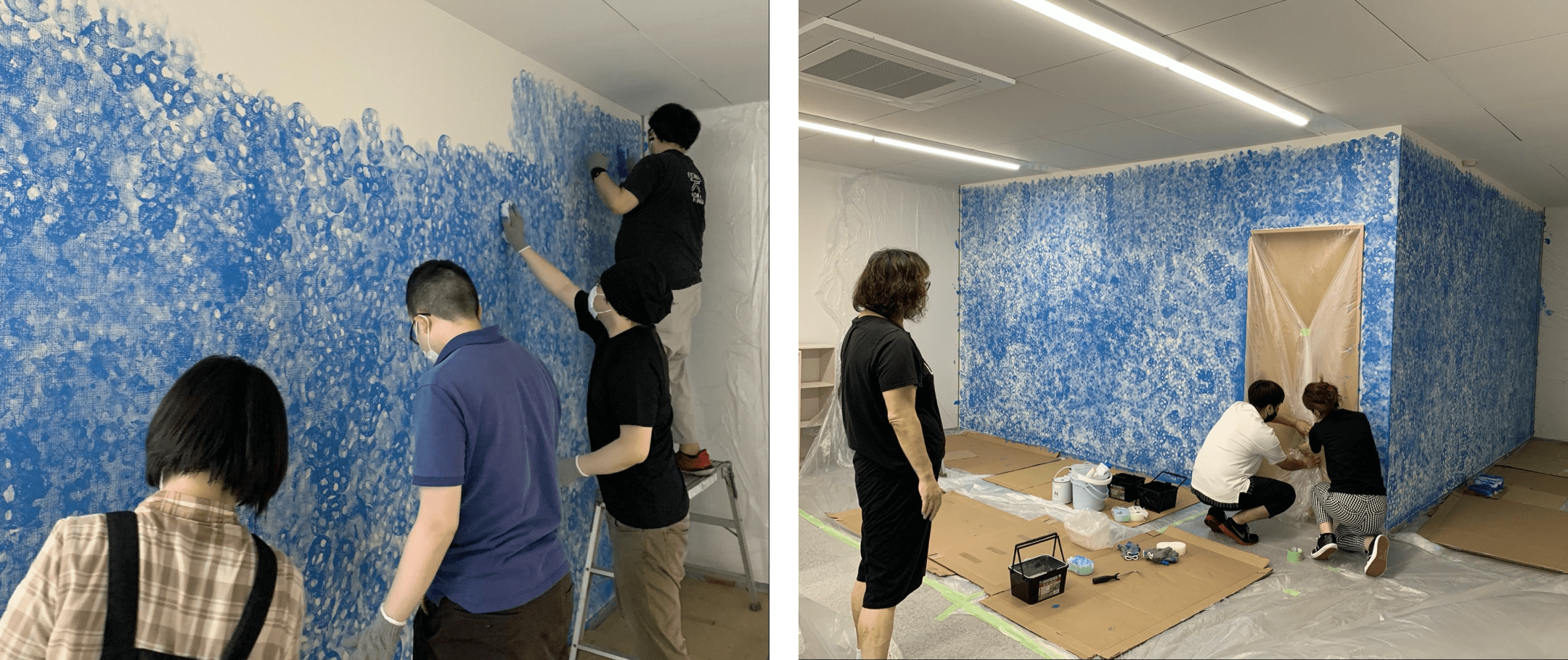 青くペイントを施しているのが支援員室です!慣れない内装作業ながら、殺風景な部屋がみるみるアートを感じさせる空間へと変わっていき、メンバーさんからも「疲れだけど、気分転換になってよかった」と前向きな振り返りをいただきました😊