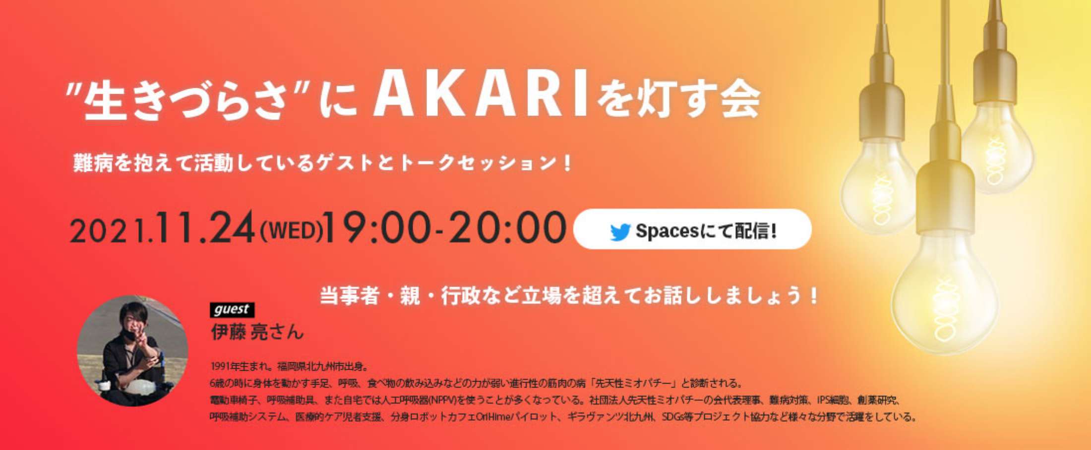 TANOSHIKA主催のAKARIのオンライインイベント、『“生きづらさ”にAKARIを灯す会』の第4回を11/24(水)の19時より1時間ほど行います!下記のTwitterのSpaces内で行います。