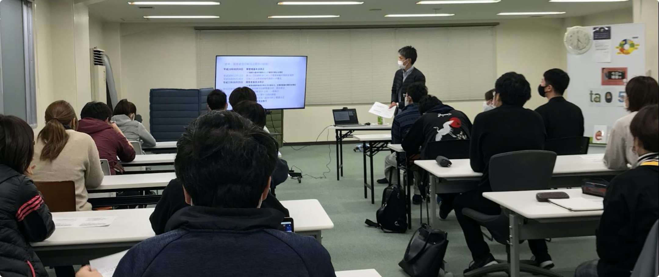 こちらは本社での全体講義の様子です。遠隔地で働くスタッフとはzoomで会場を繋いで行いました。