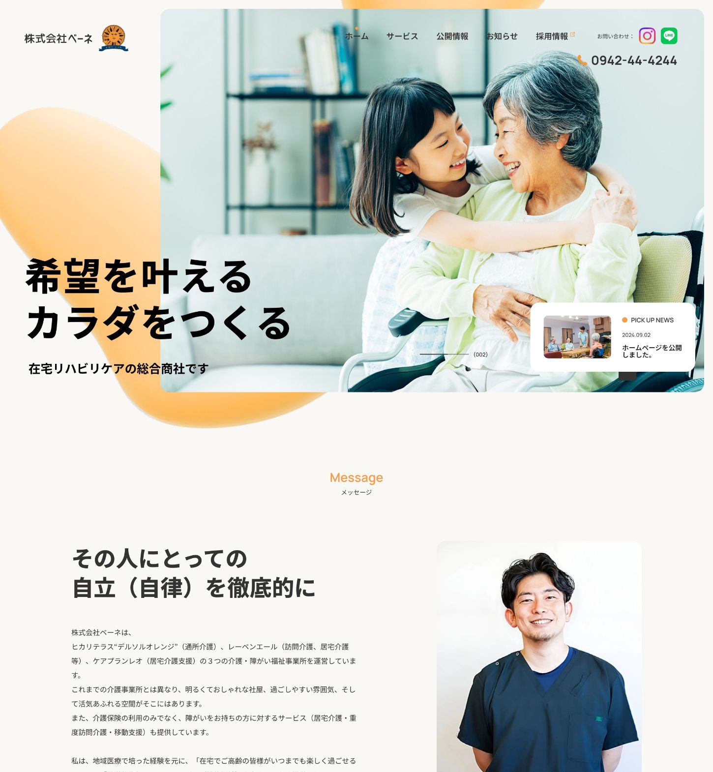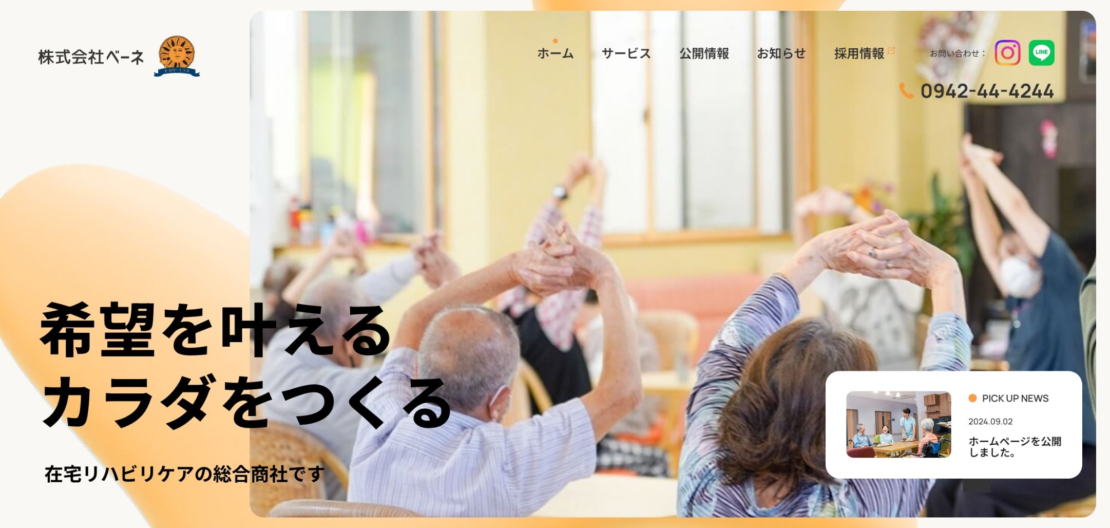 株式会社ベーネは、福岡県久留米市を拠点に、主に「在宅リハビリケア」「高齢者・障がい福祉」に関するサービスを複数展開しています。