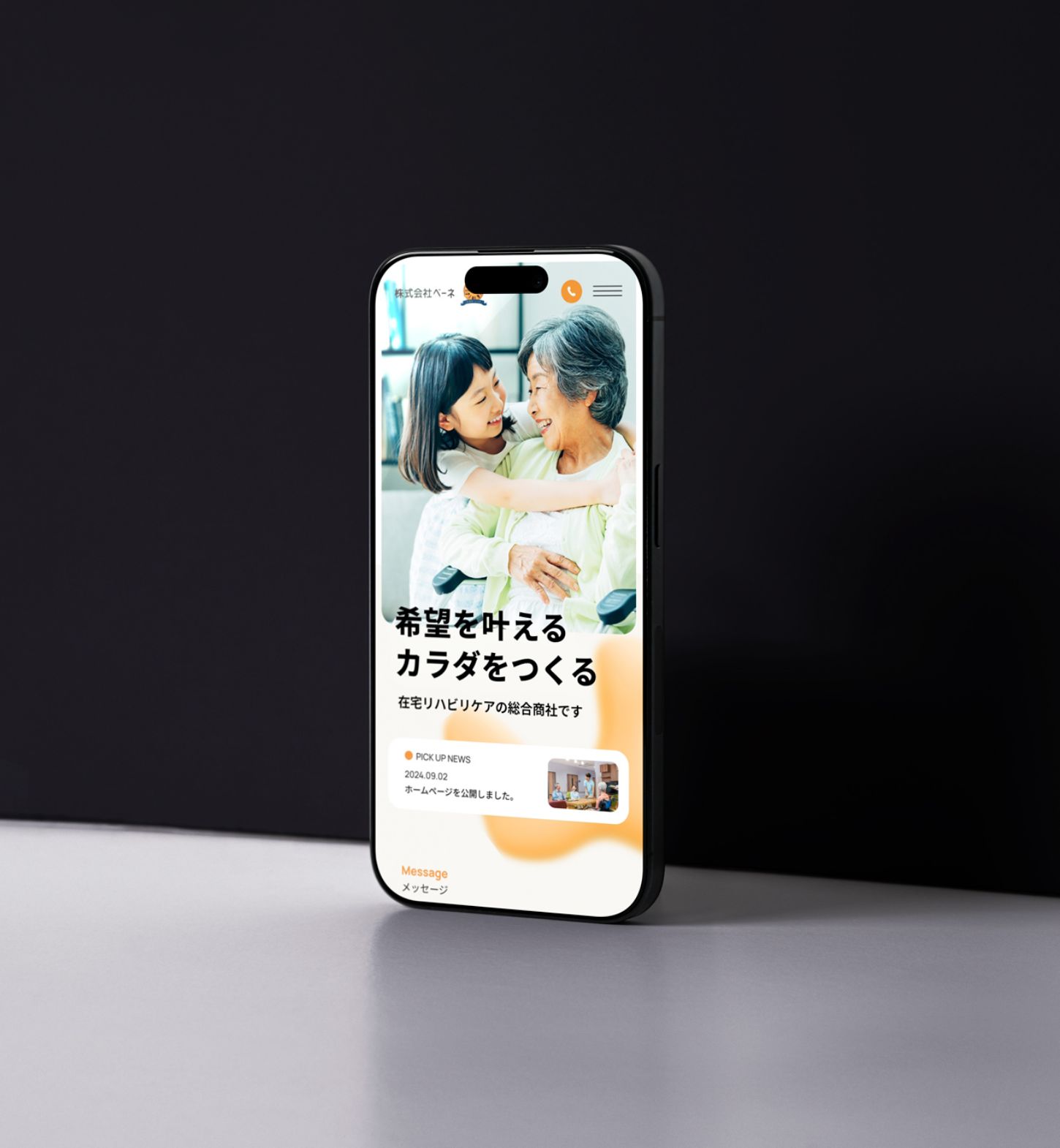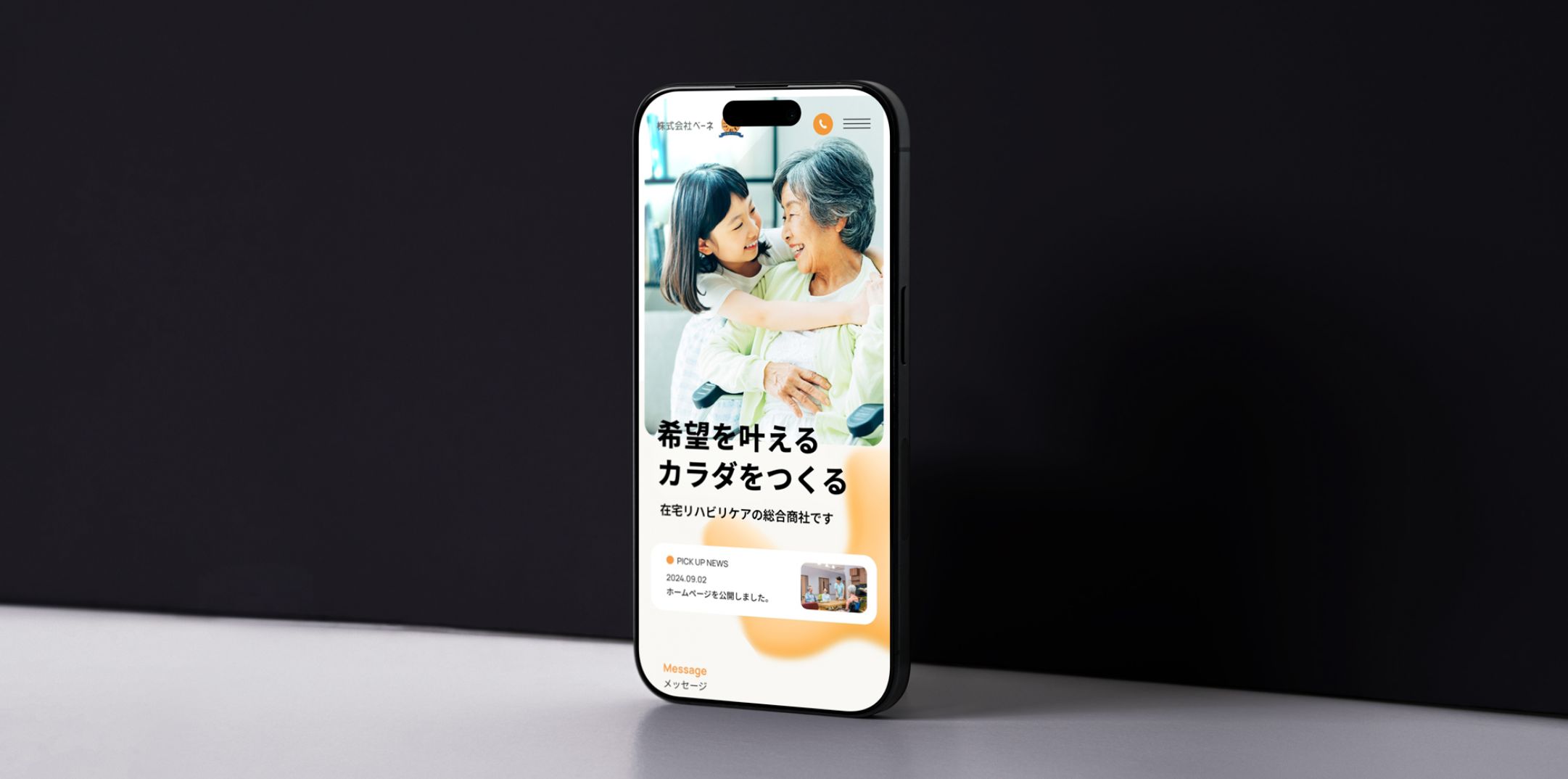 在宅リハビリケアを提供されているクライアントのご要望に沿い、「安心感」や「やさしさ」を感じられる柔らかなデザインを意識して設計しました。